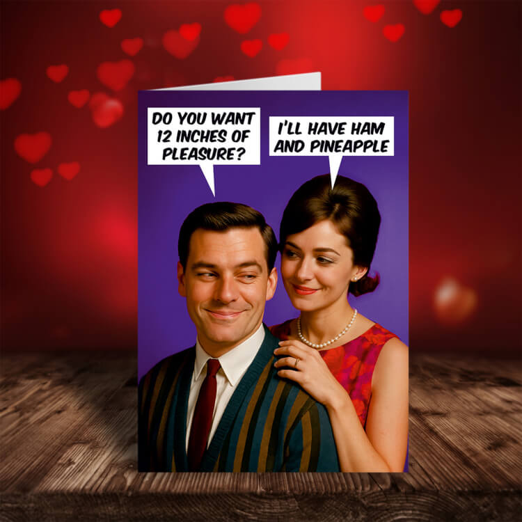 A funny Valentines card featuring a vintage-style photograph of a couple standing closely together against a purple background. A man wearing a striped cardigan looks sideways with a smirk, while a woman in a sleeveless red dress and pearl necklace stands behind him with her hand on his shoulder, smiling. A speech bubble above the man reads “Do you want 12 inches of pleasure?” and a speech bubble above the woman reads “I’ll have ham and pineapple.”
