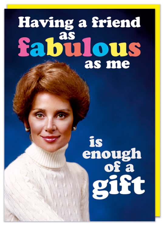 A funny birthday card featuring a retro picture of a middle aged smart woman smiling to camera in a white jumper. White and multicoloured text above and beside her reads Having a friend as fabulous as me is enough of a gift.