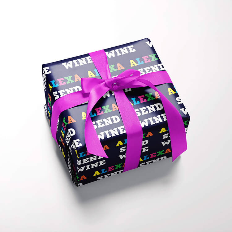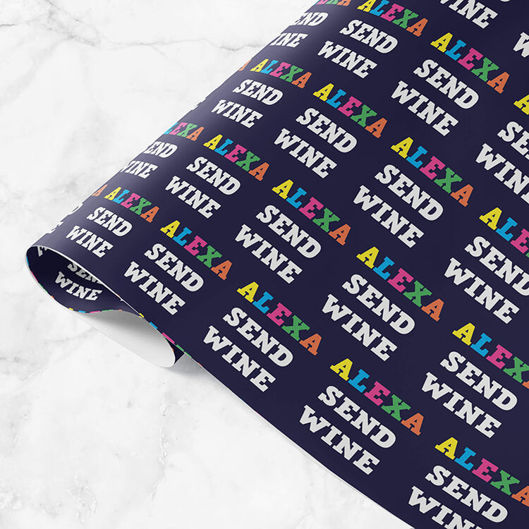 A dark purple wrapping paper with the words 'Alexa send wine' with Alexa written in yellow, light blue, pink, green and orange capital letters and 'send wine' in bold white capital letters, all in a repeating pattern across the paper.