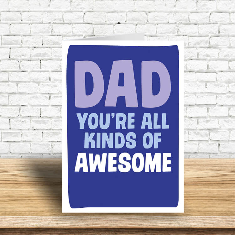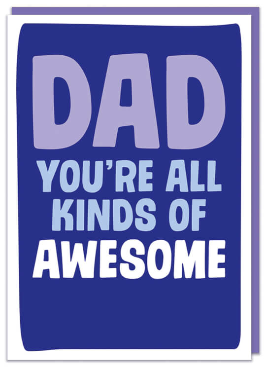 A purple Fathers Day card with text that reads Dad you're all kinds of awesome.