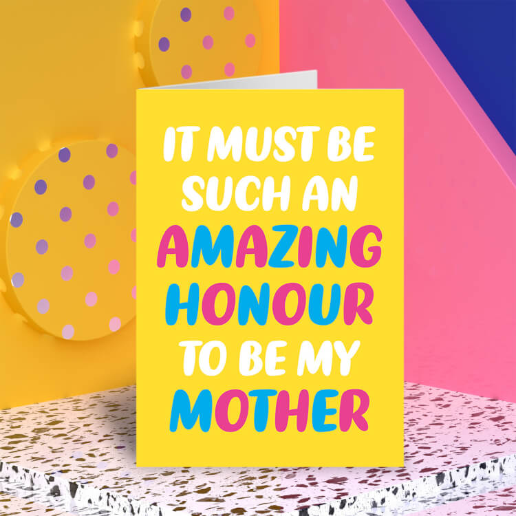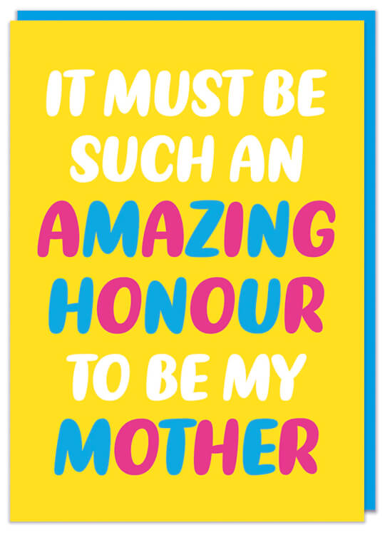 A funny yellow Mother's Day card with white and pink and blue rounded text that reads It must be such an amazing honour to be my Mother.