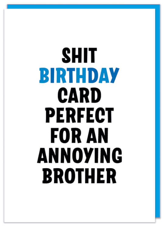 A plain white birthday card with bold black and blue text that reads Shit birthday card perfect for an annoying brother.
