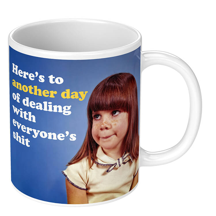 A novelty mug with a retro picture of an a bored looking girl looking into the middle distance. White rounded text above her reads Here's to another day of dealing with everyone's shit.