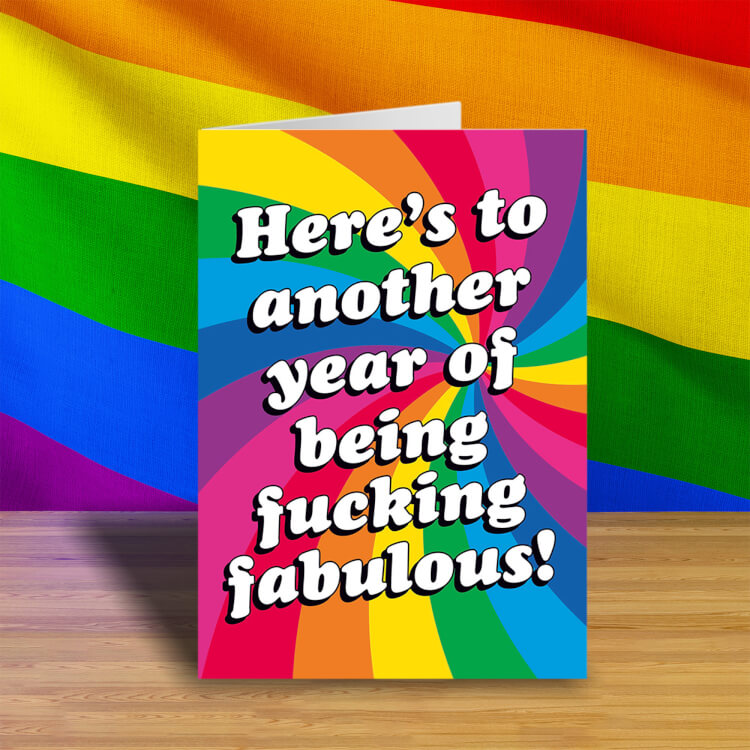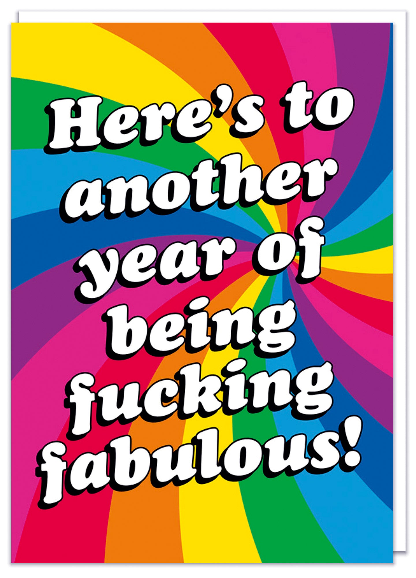 A bright rainbow coloured birthday card with bold white shadowed text that reads Here's to another year ofbeing fucking fabulous!