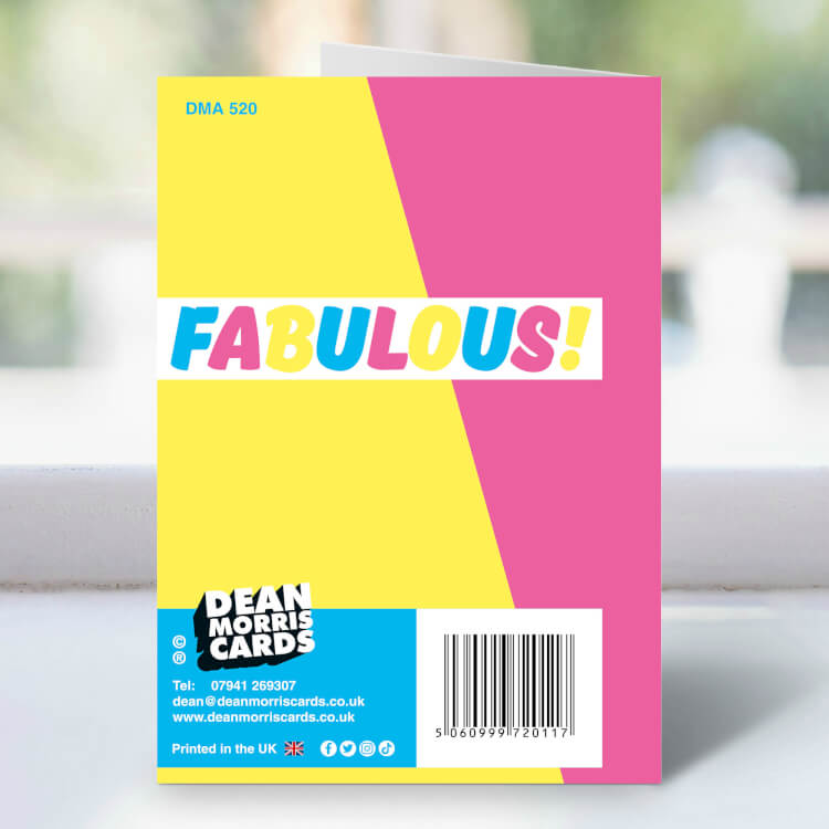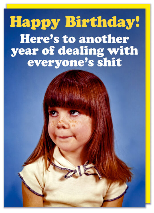 A birthday card with a retro picture of an a bored looking girl looking into the middle distance. Yellow and white rounded text above her reads Happy Birthday! Here's to another year of dealing with everyone's shit.