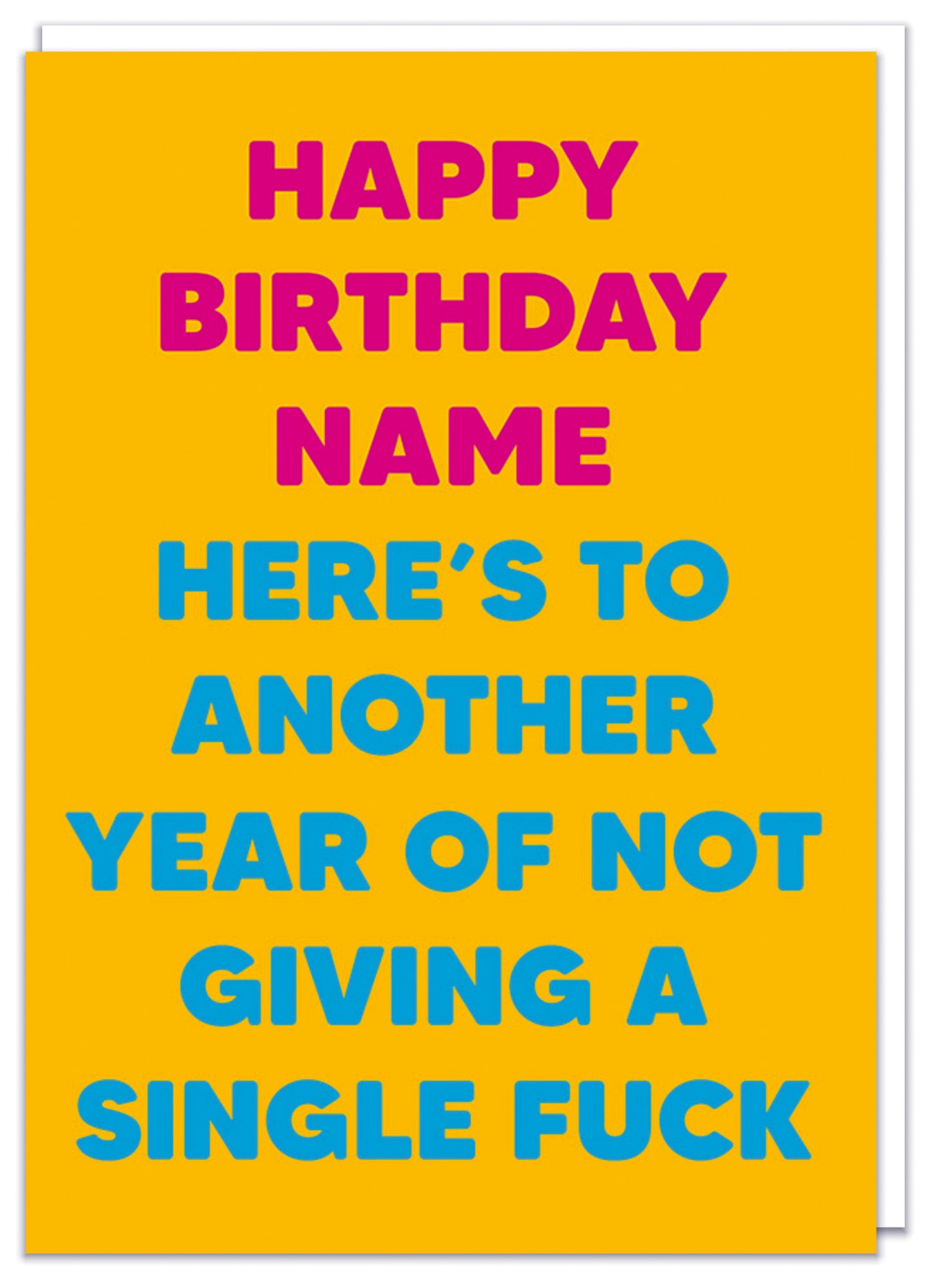 A funny personalisable deep yellow birthday card with pink and blue text that reads Happy birthday - name - Here's to another year of not giving a single fuck.