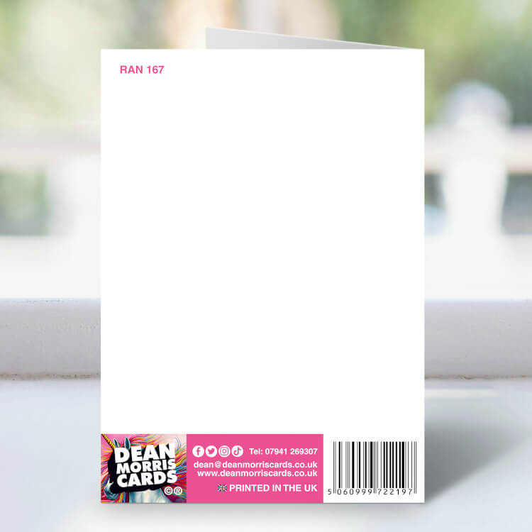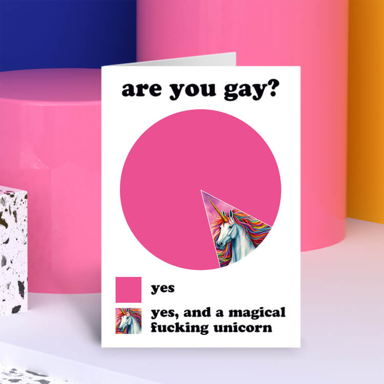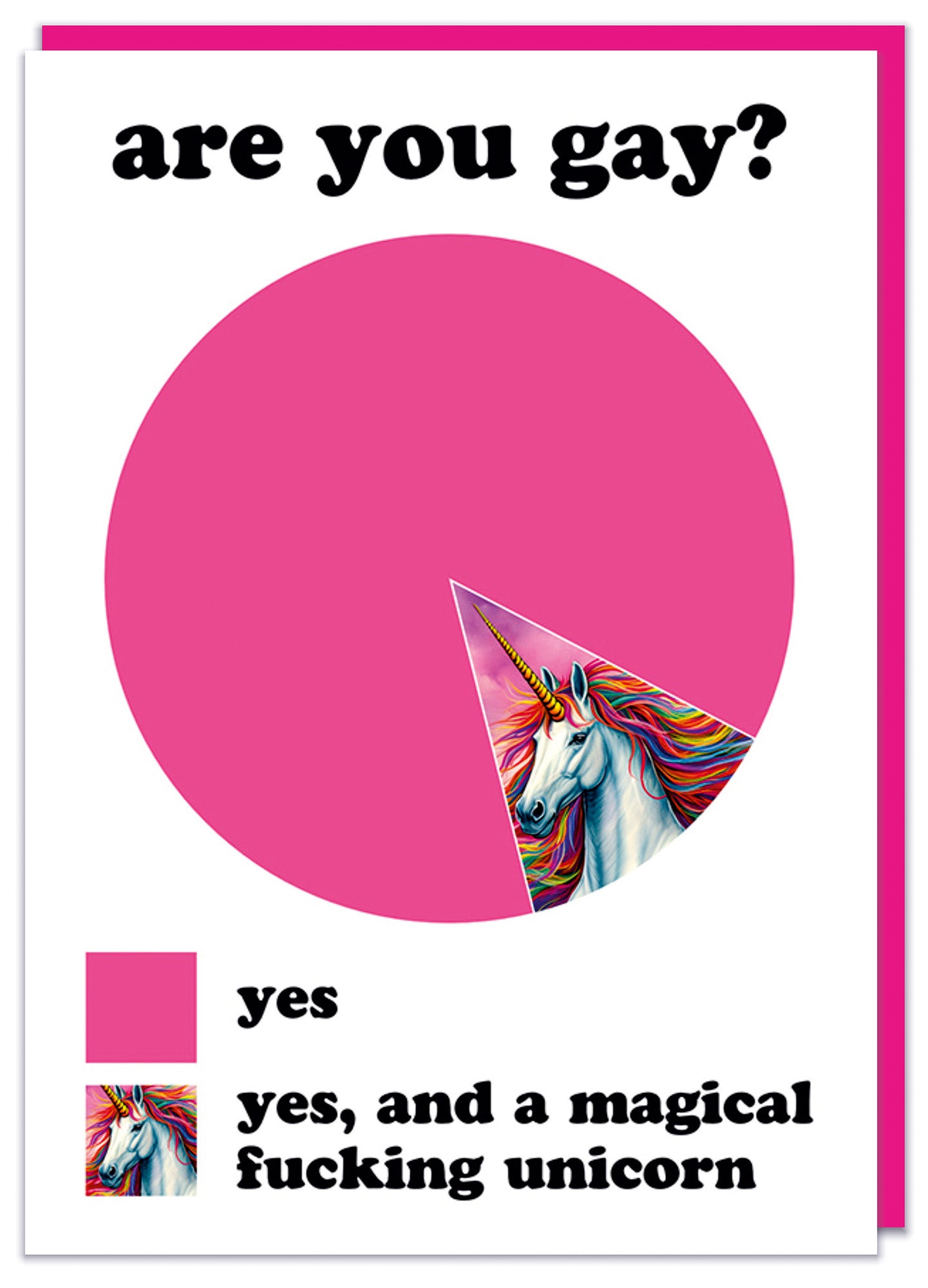 A funny white birthday card with a pie chart split into pink and a picture of a rainbow unicorn. The card asks Are you gay? with the options being Yes and Yes, and a magical fucking unicorn.