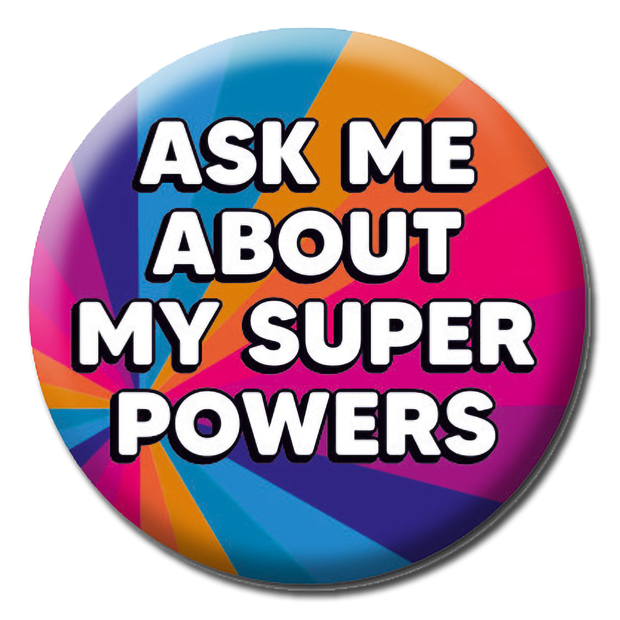 A round badge featuring a bold, colorful abstract background made up of swirling shapes in pink, orange, blue, and purple. Large white block text in the center reads “Ask me about my super powers.”