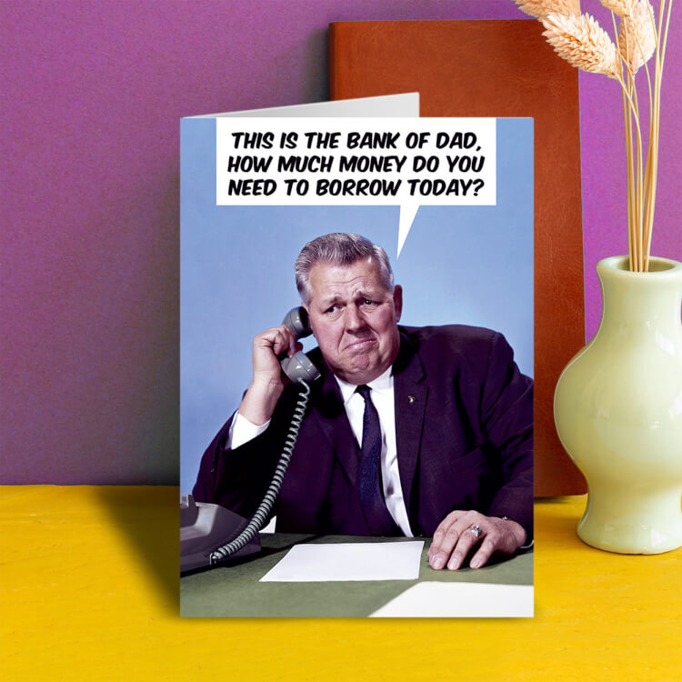 A Fathers Day card with a retro photo of a man on the telephone with a speech bubble reading This is the bank of Dad, how much money do you need to borrow today?