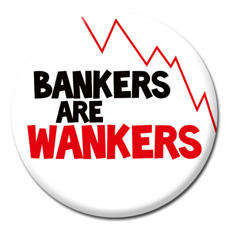 A white badge detailing a graph heading downwards above bold black and white text that reads Bankers are wankers.