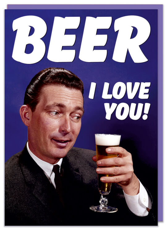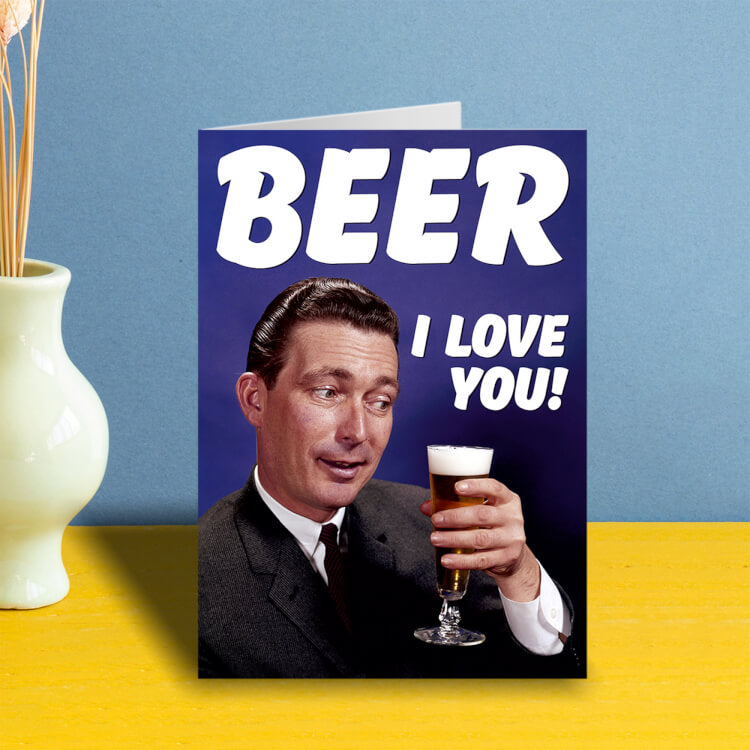 A greeting card with a 1960s picture of a man holding a pint. White text above him reads Beer I love you!
