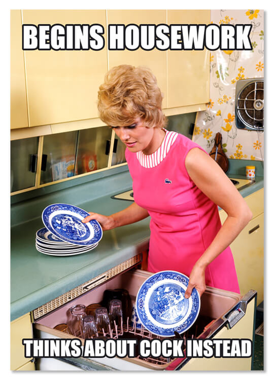 Ah, it happens. One moment you're engrossed in the mundane chores of every day domestication and the next you're off on a steamy fantasy. Housework is underrated... A retro seventies picture postcard of a lady in a pink dress, packing the dishwasher and the words 'Begins Housework. Thinks About Cock Instead' in bold, white capital letters outlined in black.
