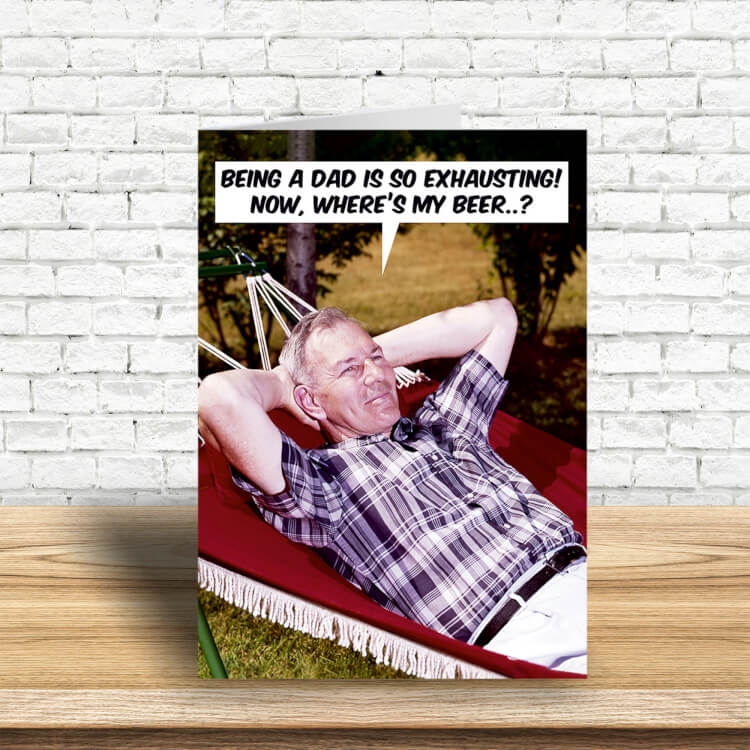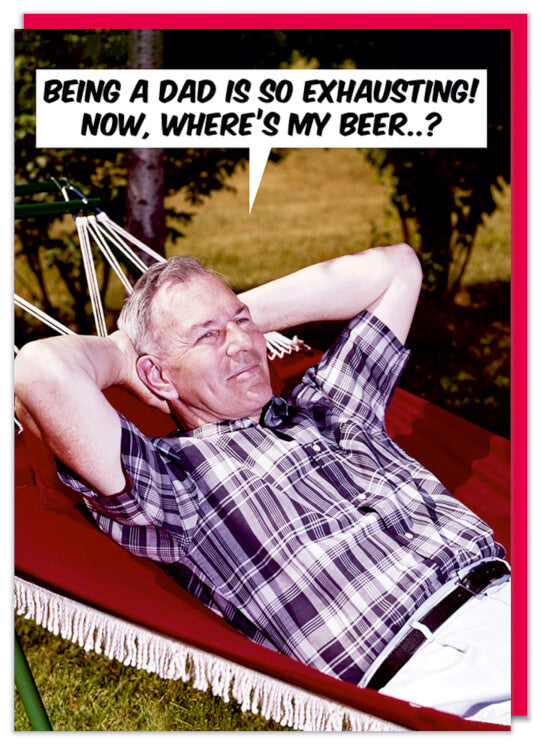 A Father's Day card featuring a 1960s picture of an older man lounging in a hammock. He says Being a Dad is so exhausting! Now, where's my beer..?