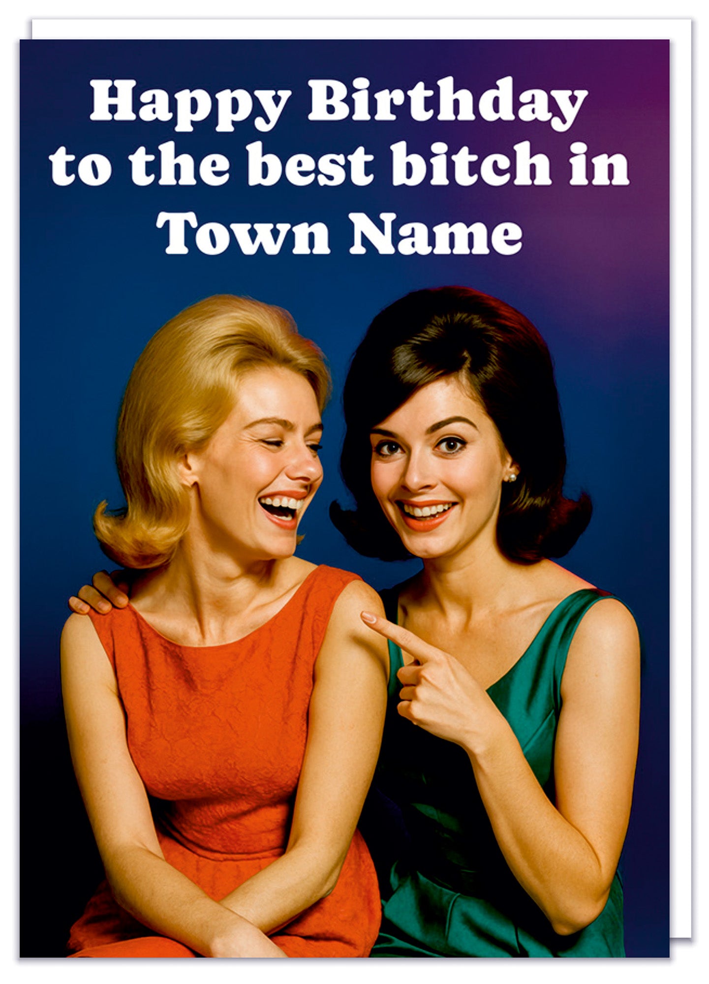 A funny personalisable birthday card with a 1960s picture of two smiling women laughing and pointing at each other. White text above reads Happy birthday the best bitch in - town name.