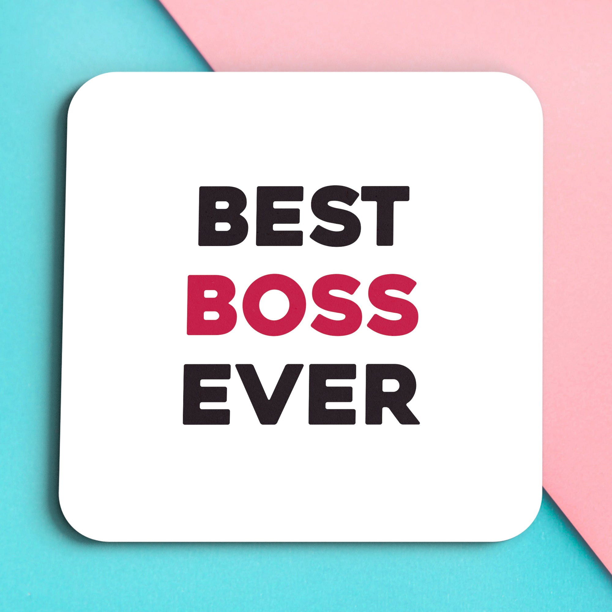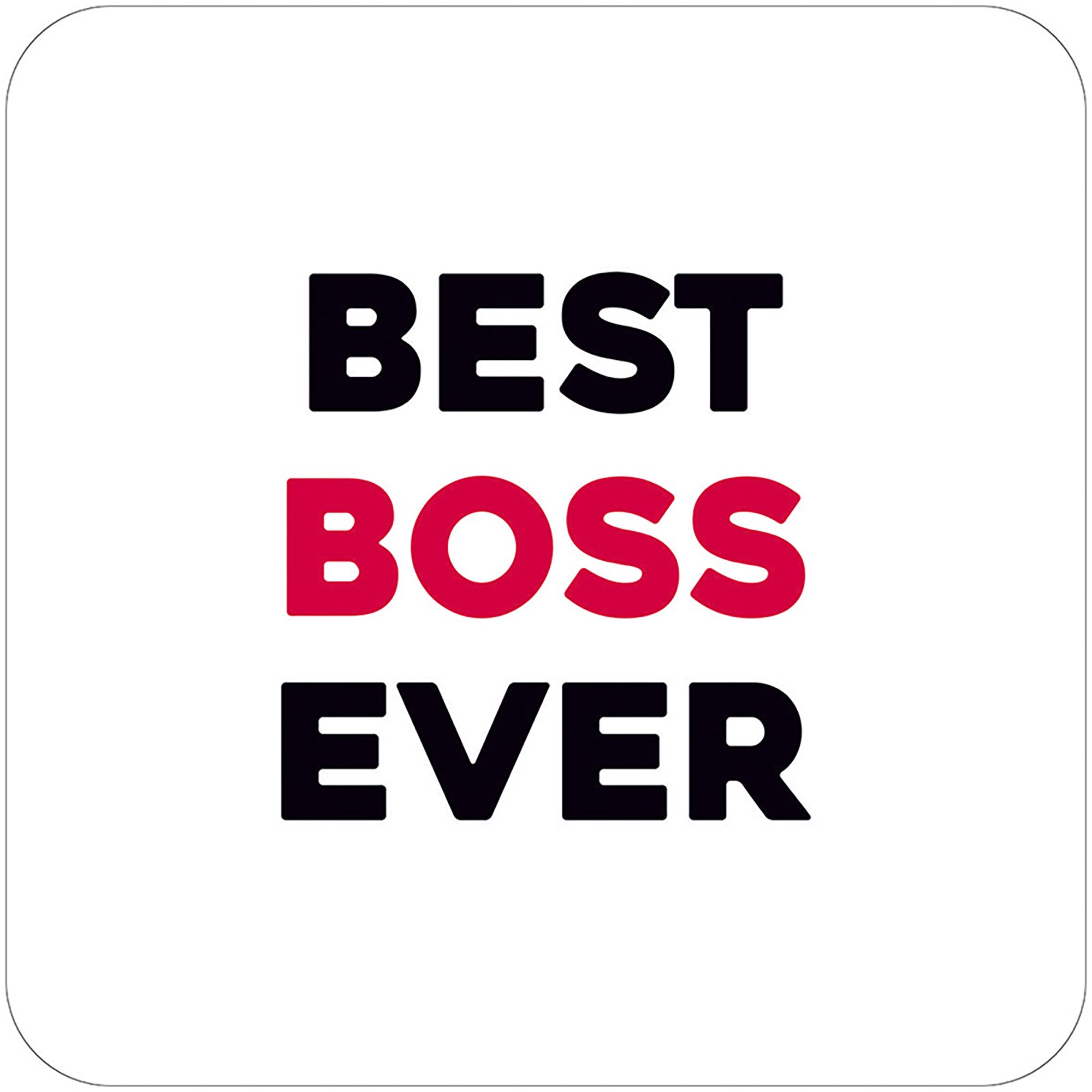 Best boss ever is displayed in bold lettering on a clean white square coaster with rounded corners. The words best and ever are written in black, while boss stands out in bright red at the centre. The design is simple, modern, and graphic, using high contrast colours and a clear layout to create a confident, celebratory message.