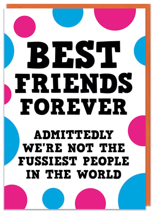 A white birthday card with black capital text reading Best friends forever. Admittedly we're not the fussiest people in the world. This is surrounded by pink and blue circles.