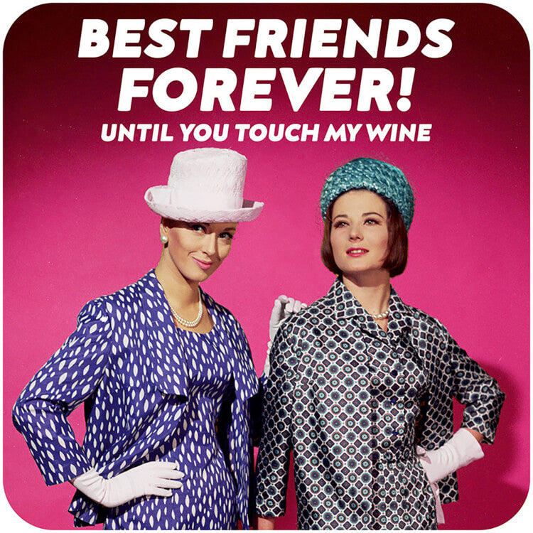 A coaster with a retro photo of two glamorous women in 1960's suits and hats against a pink background. White text above reads Best friends forever! Until you touch my wine