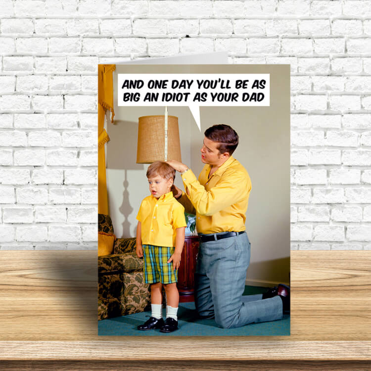 A Father's Day card featuring a 1960s picture of a Father measuring the height of his young son, both in bright yellow shirts. The dad is saying And one day you'll be as big an idiot as your dad.