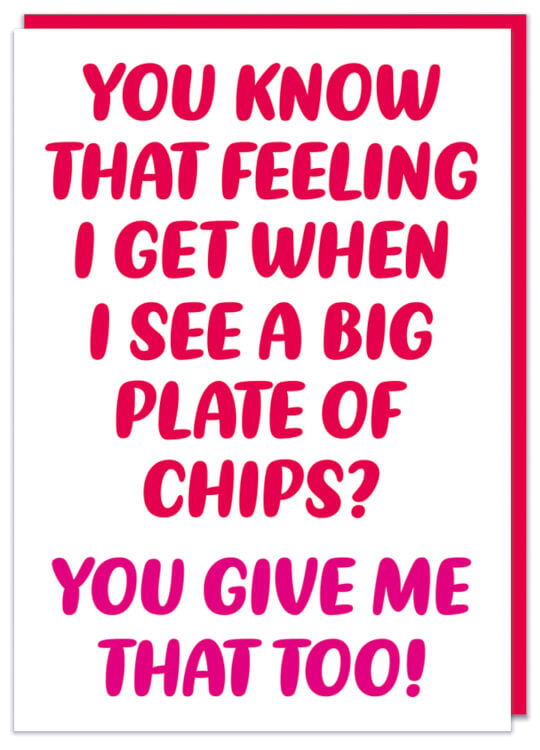 A simple white Valentine's Day Card featuring rounded red and pink text that reads You know that feeling i get when I see a big plate of chips? You give me that too.