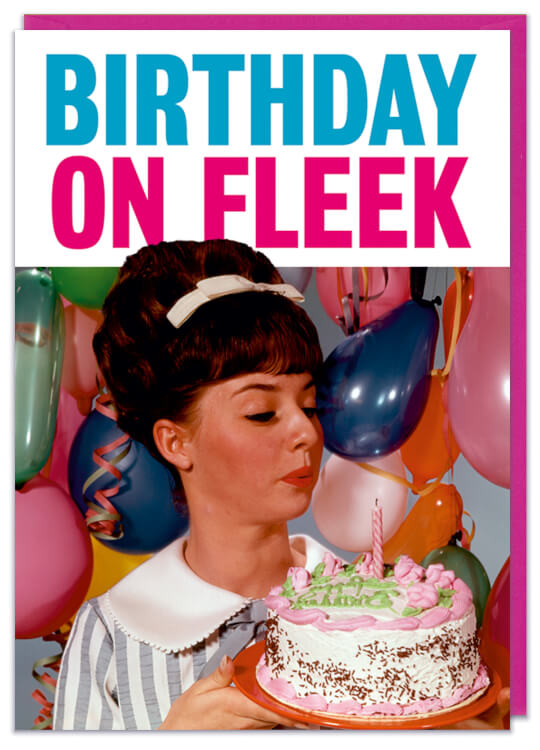 Blue and pink text above reads Birthday on fleek.Additional Information