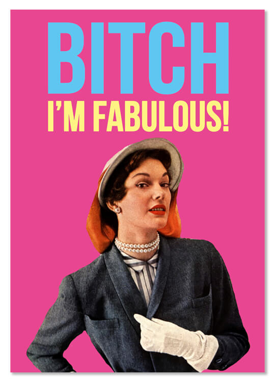 Feeling fabulous? Now you can tell everyone about it, as if they didn't know already, darlings! A pink postcard with a retro sixties picture of a young woman with pearls around her neck, dressed in a blazer top and hat, gloves and shirt, looking to camera. Has blue and yellow writing, saying 'Bitch I'm Fabulous' in capitals.