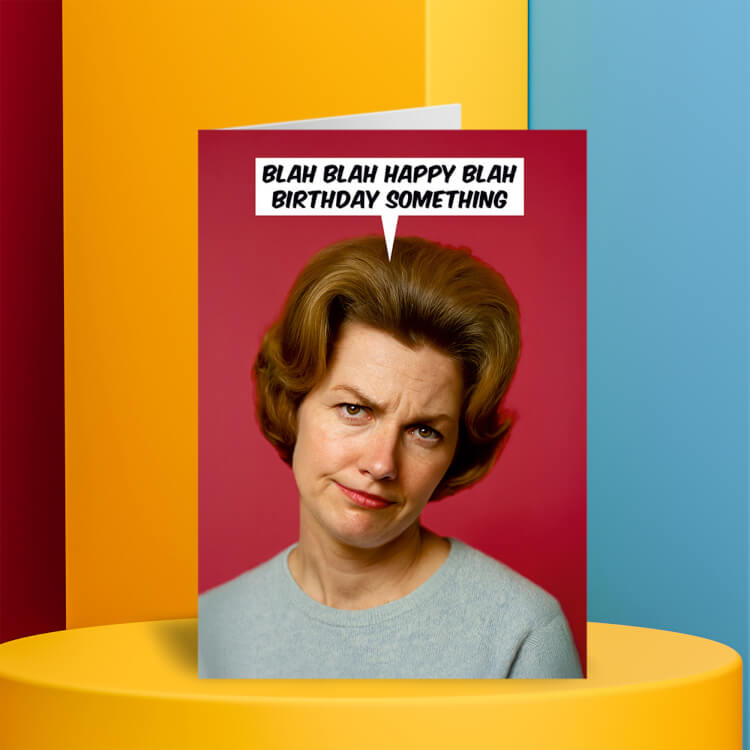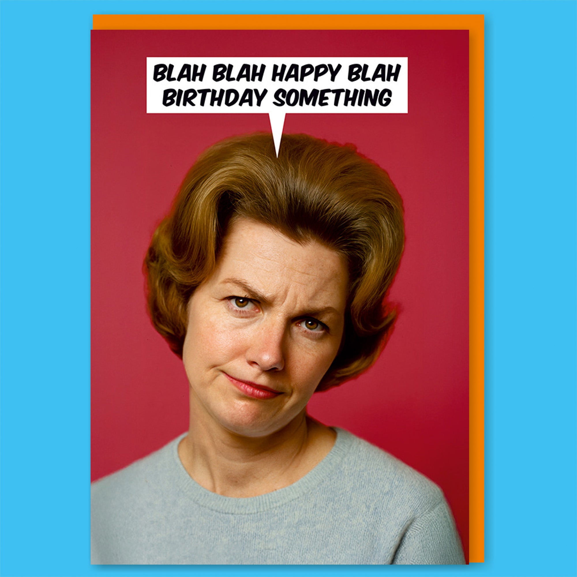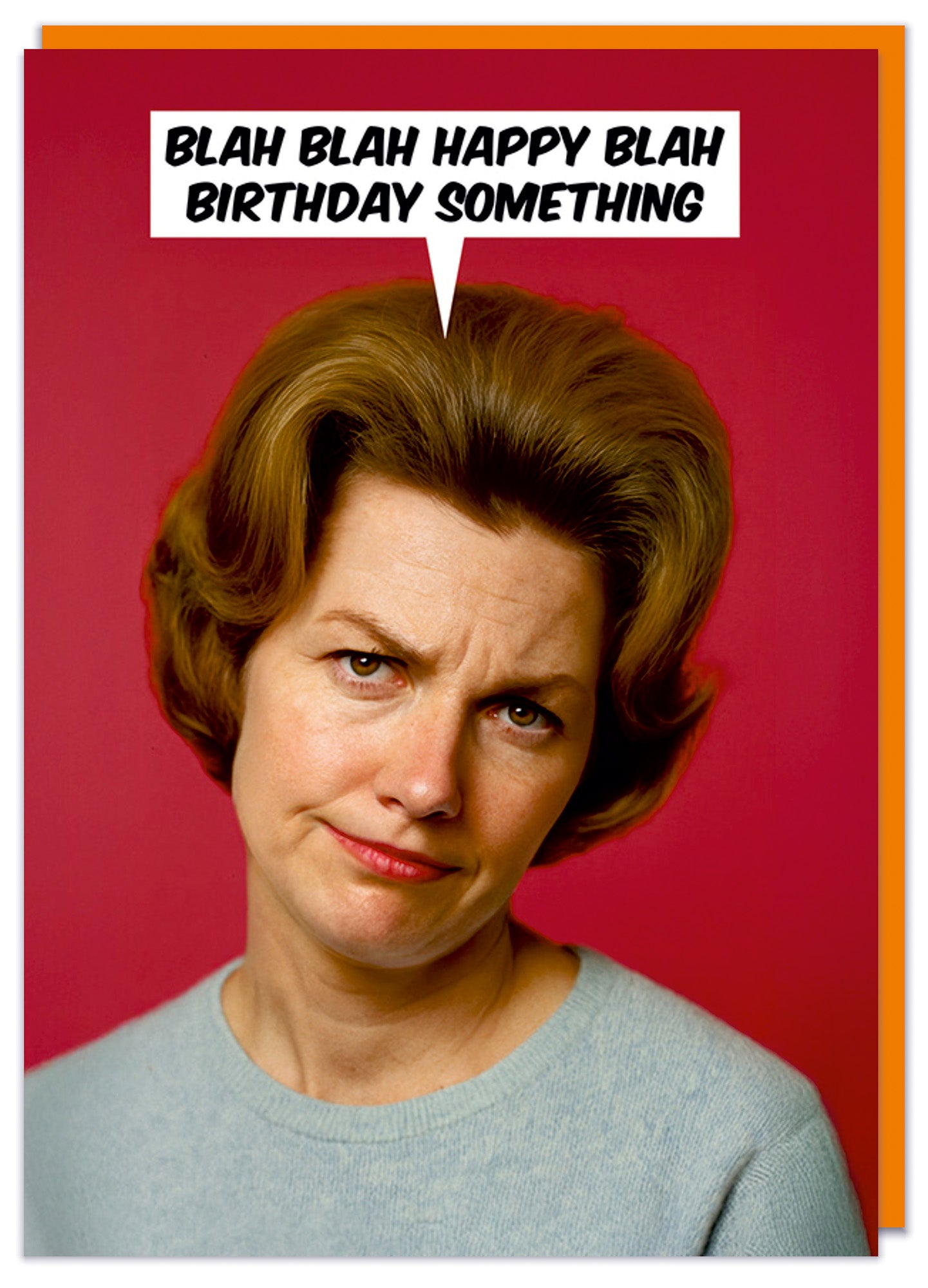 A funny greeting card featuring a vintage-style portrait of a woman with neatly styled brown hair, wearing a light-colored sweater and looking at the viewer with a mildly unimpressed, skeptical expression. The background is a solid deep pink. A speech bubble above her head reads “Blah blah happy blah birthday something.”