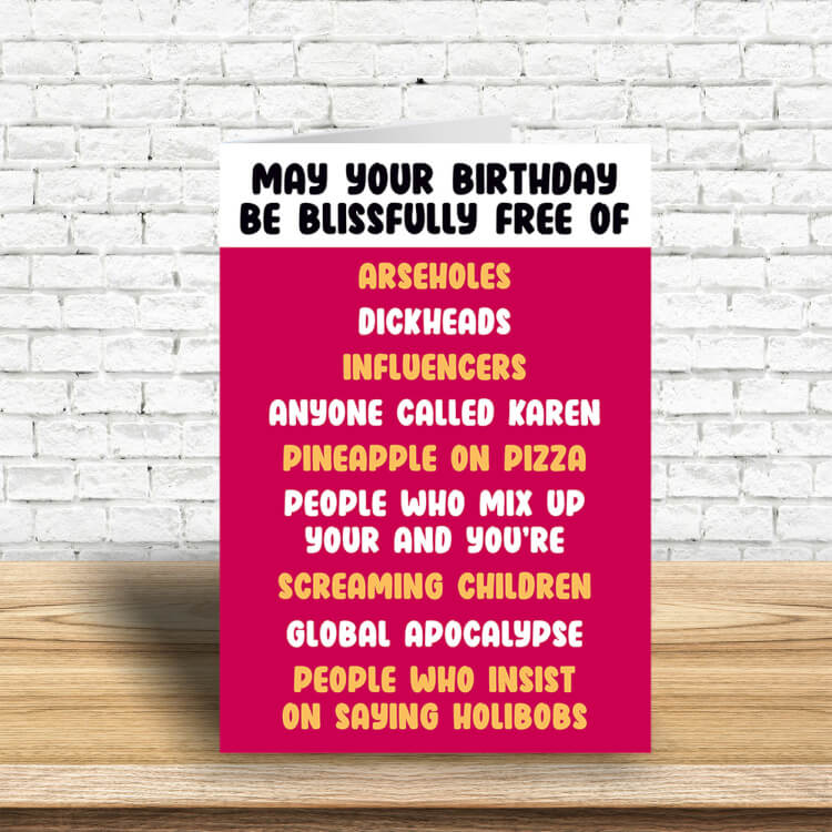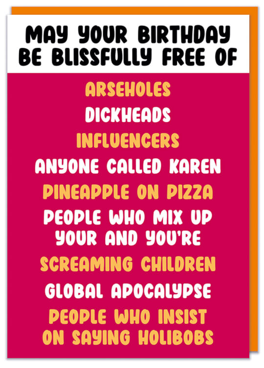 A deep red birthday card with black text in a white box at the top that reads May your birthday be blissfully free of. Below this in white orange text the list reads: Arseholes, dickheads, influencers, anyone called karen, pineapple on pizza, people who mix up your and you're, screaming children, global apocalypse, people who insist on saying holibobs.