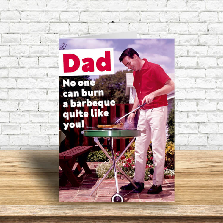 A Fathers Day card with a retro photo of a man attending to his barbeque with text on the left hands side of the card reads Dad no one can burn a barbeque quite like you.