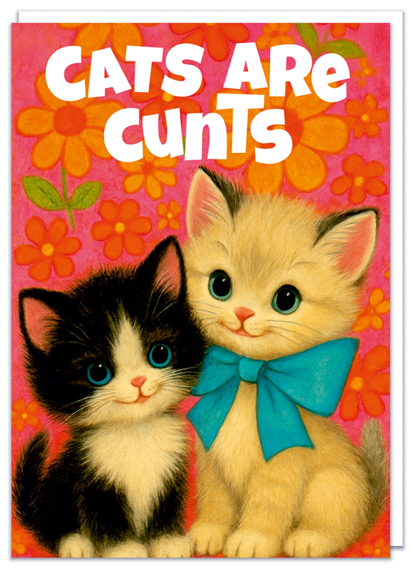 A funny birthday card featuring a vintage kitsch illustration of two kittens. Bold white text above them reads Cats are cunts.