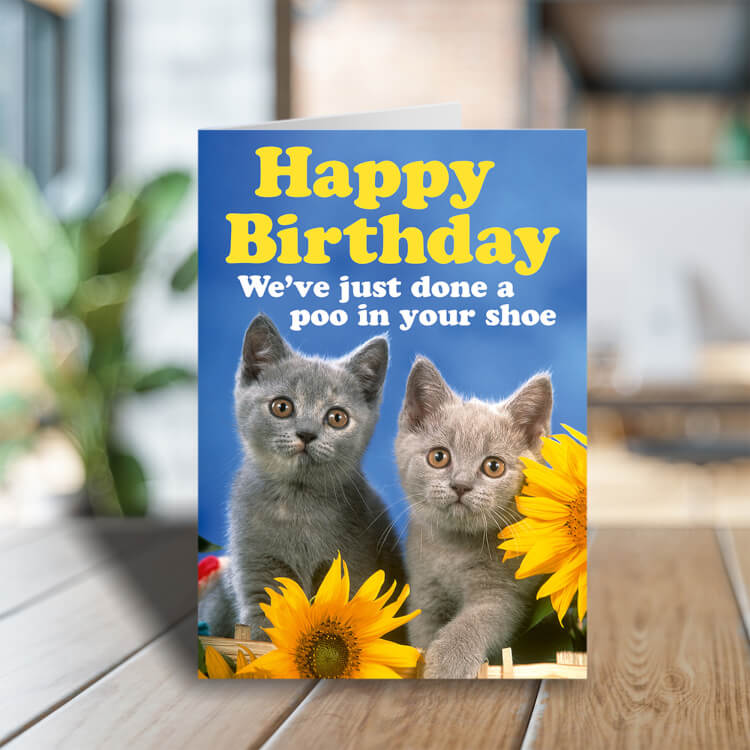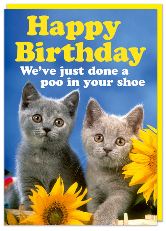 A birthday card with a kitsch photo of two cats surrounded by sunflowers looking at the camera. Yellow and white text above them reads Happy Birthday We've just done a poo in your shoe.