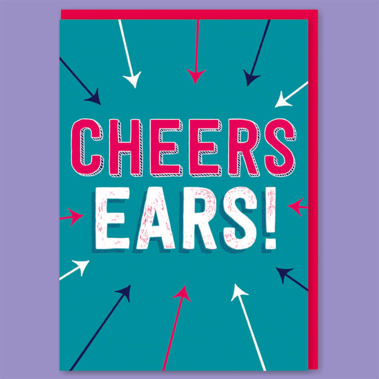 A light blue thank you card with the words ‘Cheers ears!’ written in pink and white doodling style, 3D font, and all around are pink, blue and white arrows pointing to it.