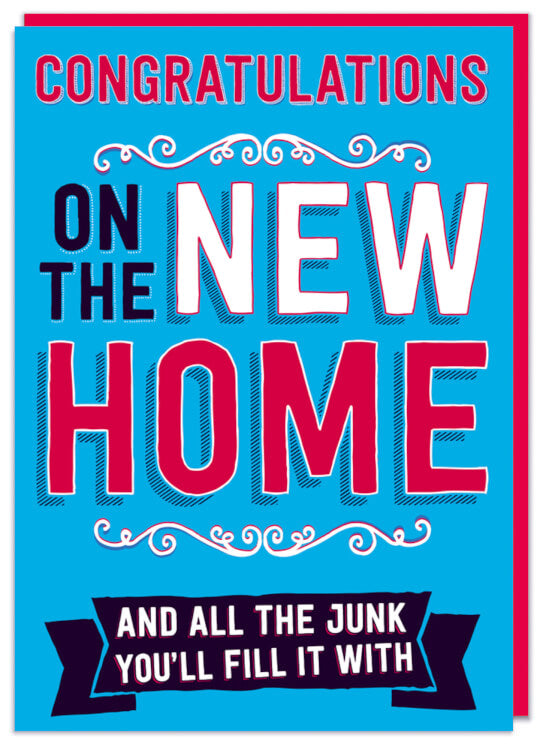 A light blue new home card with the words ‘Congratulations on the new home and all the junk you’ll fill it with.’ in capitalised pink, white and black doodling style, 3D font.