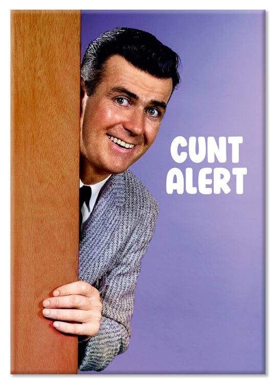A fridge magnet with a retro picture of a smiling man peering around a wooden door and smiling to camera. Bold white text beside him reads Cunt alert.