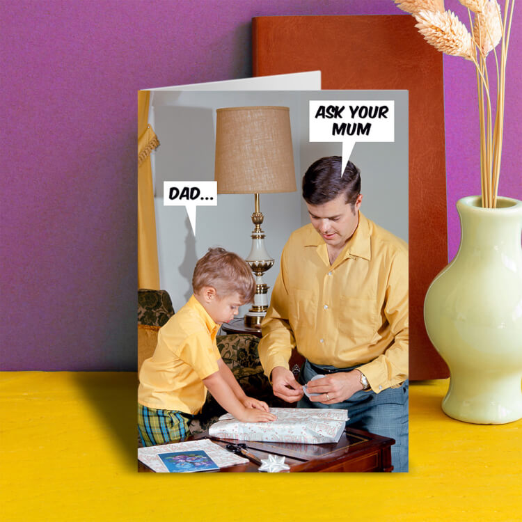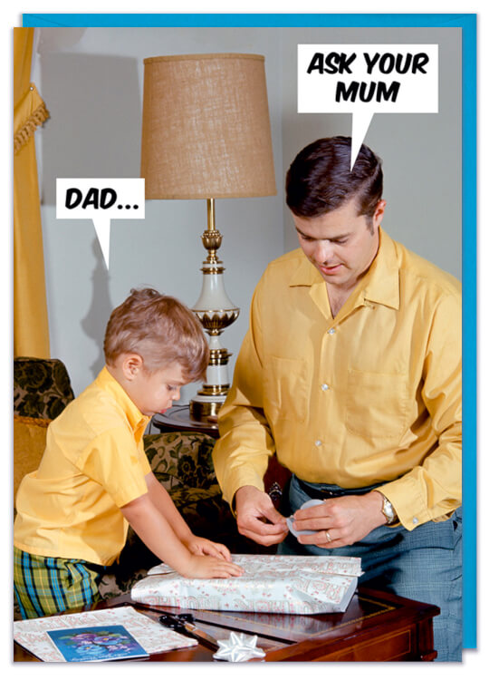 A Fathers Day card with a 1960s picture of dad helping his son wrap a present. The son says Dad... To which he replies ask your Mum.