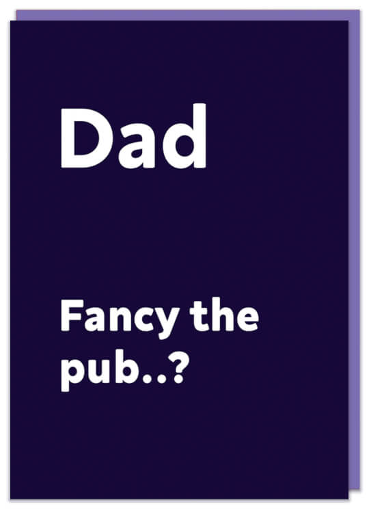 A navy blue Father's Day card with simple white text reads Dad fancy the pub?