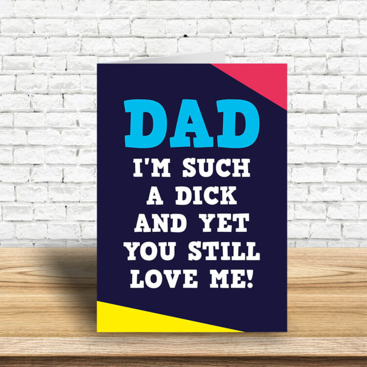 A navy blue Fathers Day card with a red and yellow coloured corners. Blue and white text in the middle reads Dad I'm such a dick and yet you still love me.