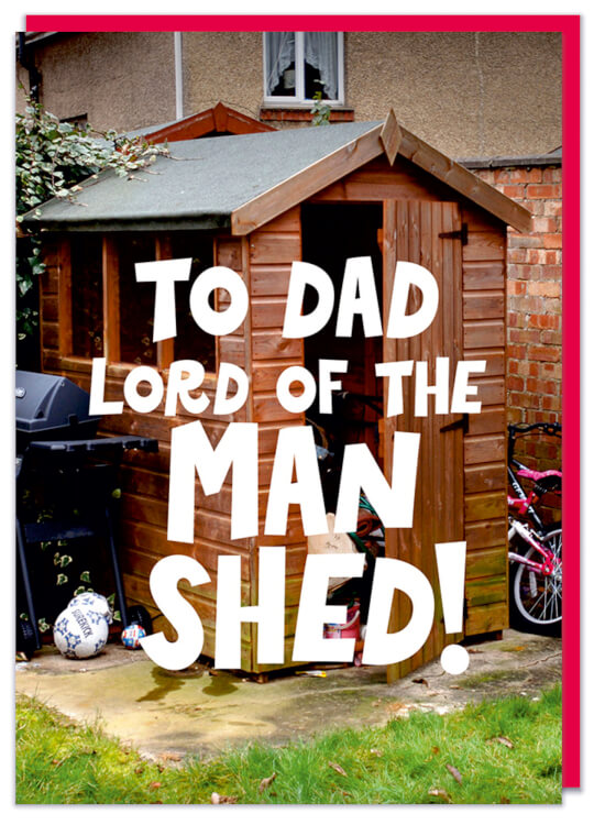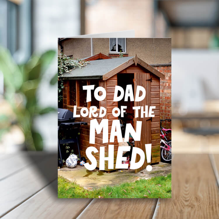 A greeting Card with a photo of a typical British messy shed at the bottom of the garden. Bold white text over the image reads To Dad lord of the man shed.