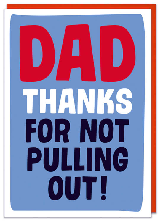 A blue Fathers Day card with text that reads Dad thanks for not pulling out.