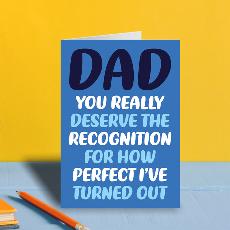 A funny blue Father's Day card with white, dark blue and pale blue rounded text that reads Dad You really deserve the recognition for how perfect I've turned out.