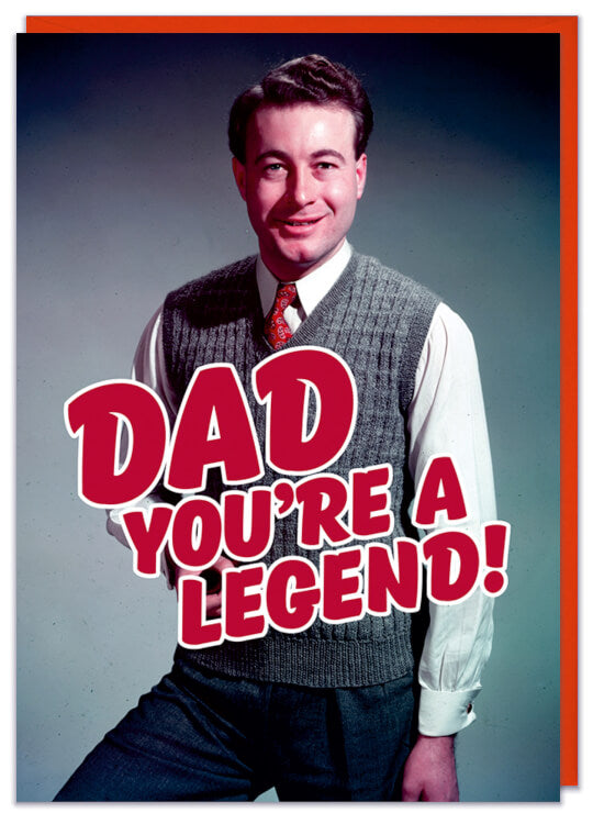 A Fathers Day card with a 1960s picture a smiling man. Red text in front of him reads Dad you're a legend!