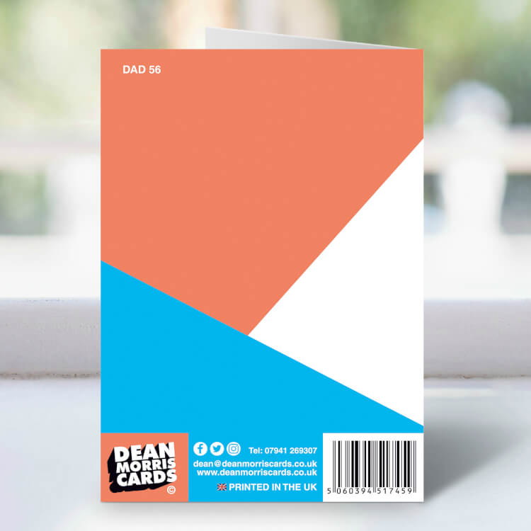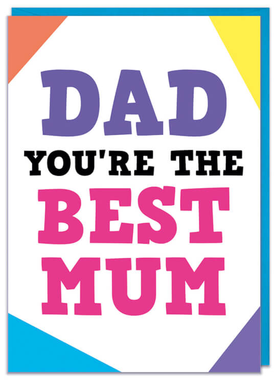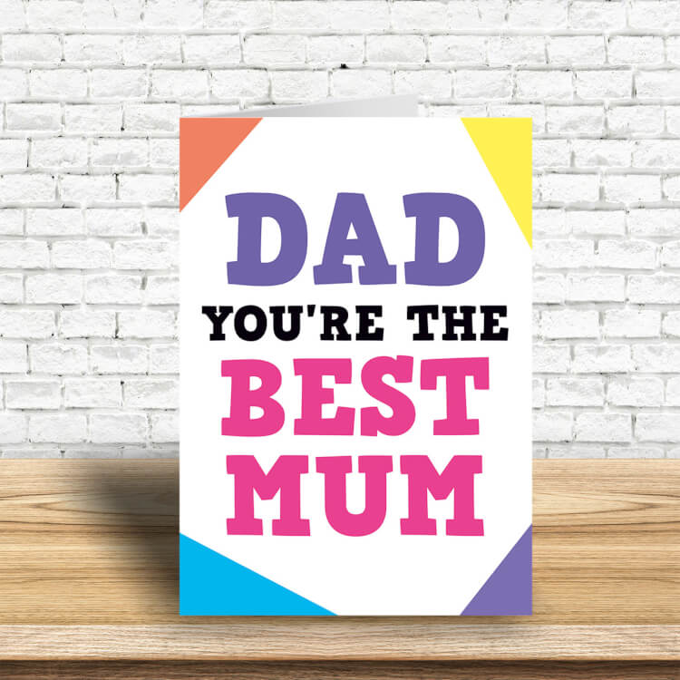 A White Fathers Day card with an orange, yellow, purple and blue corner. Purple, black and pink text in the middle reads Dad you're the best Mum.