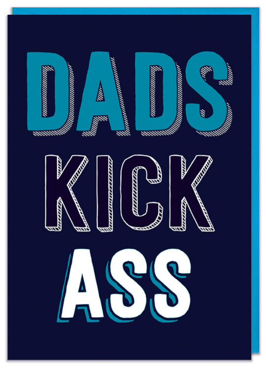 A navy blue Fathers Day card with with blue and white text that reads Dads kick ass.