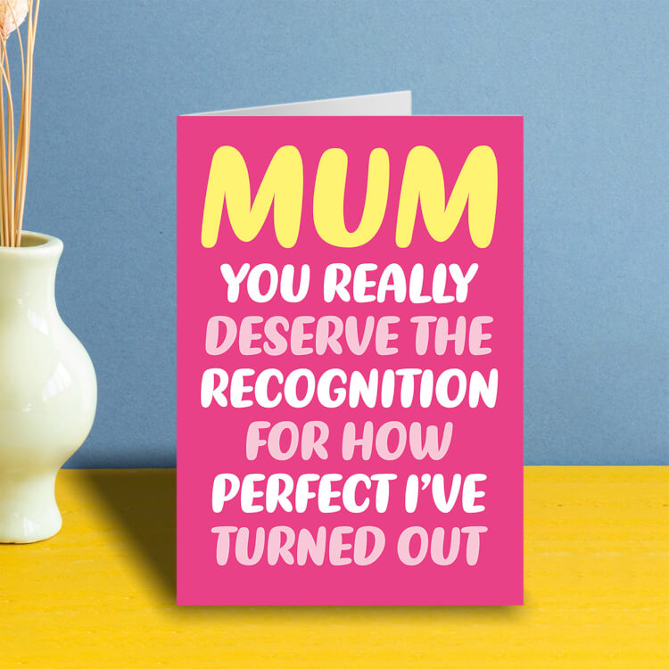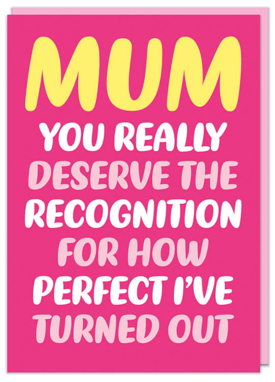 A funny pink Mother's Day card with white, pink and yellow rounded text that reads Mum You really deserve the recognition for how perfect I've turned out.