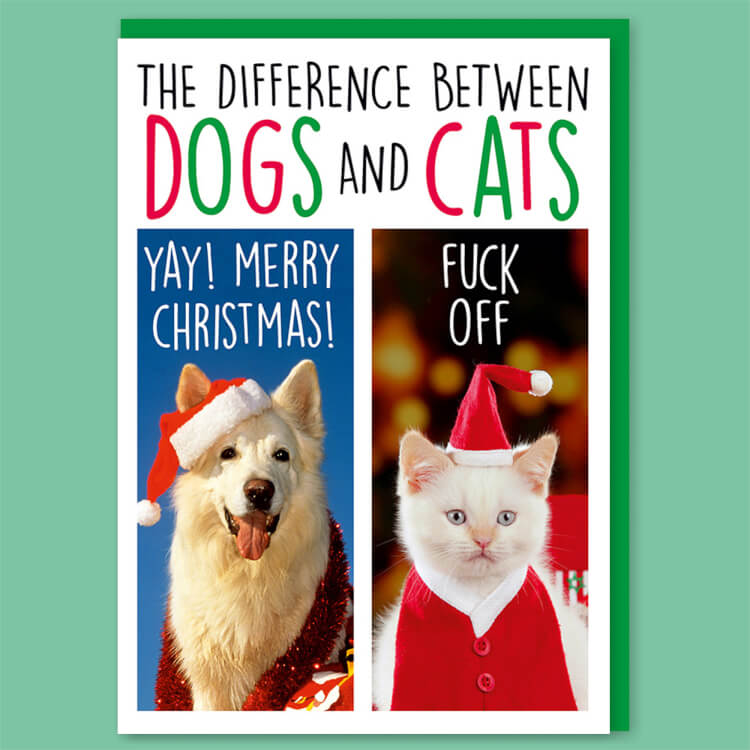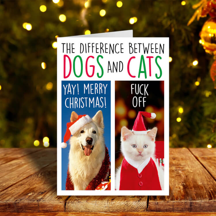 A Christmas card with a two pictures of a smiling dog and a miserable cat, both dressed as Santa Claus. Text above them reads The difference between dogs and cats. The dog excitedly says Yay! Merry Christmas and the cat simply says Fuck off.