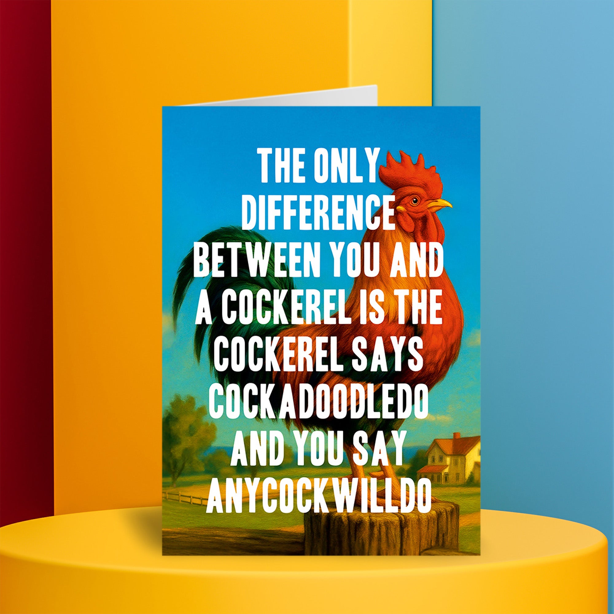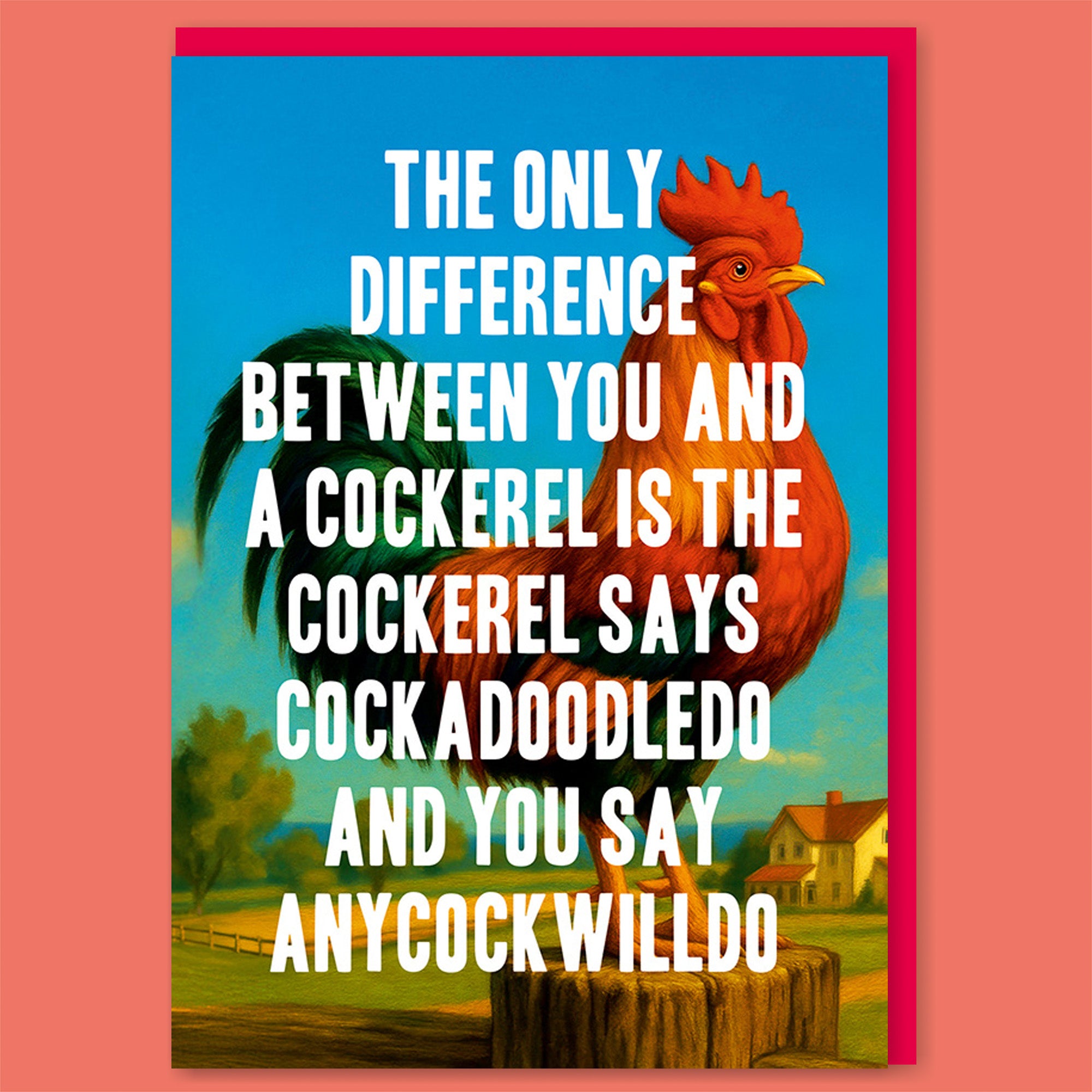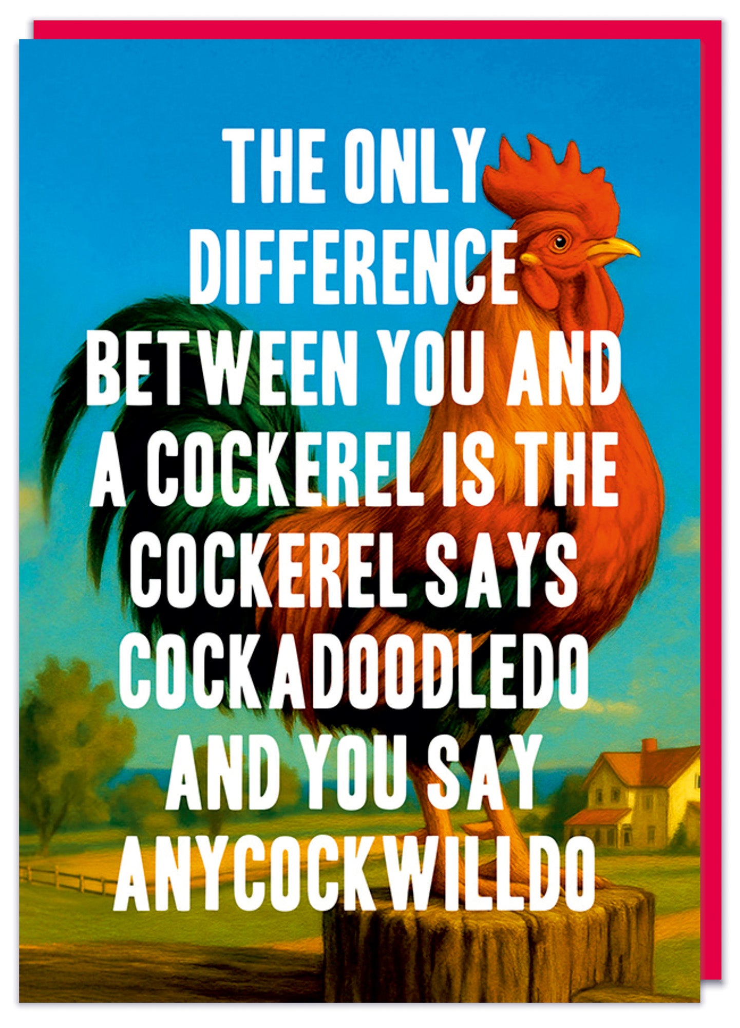 A funny birthday card featuring an illustration of a large red cockerel standing on a wooden post in a rural landscape with blue sky and distant houses. Large bold white text fills most of the card and reads “The only difference between you and a cockerel is the cockerel says cockadoodledoo and you say anycockwilldo.”