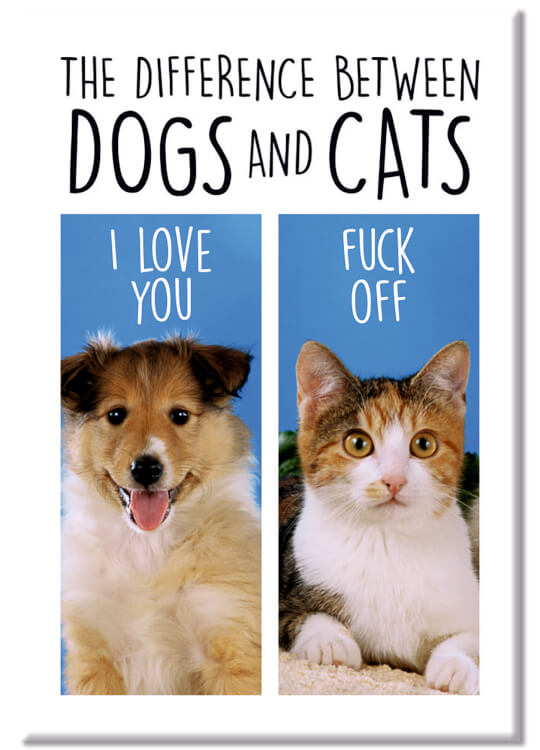 A fridge magnet with two pictures on the front, a happy looking dog and an aloof looking cat. The dog is saying I love you and the cat is saying fuck off. Text above these pictures reads The difference between dogs and cats.