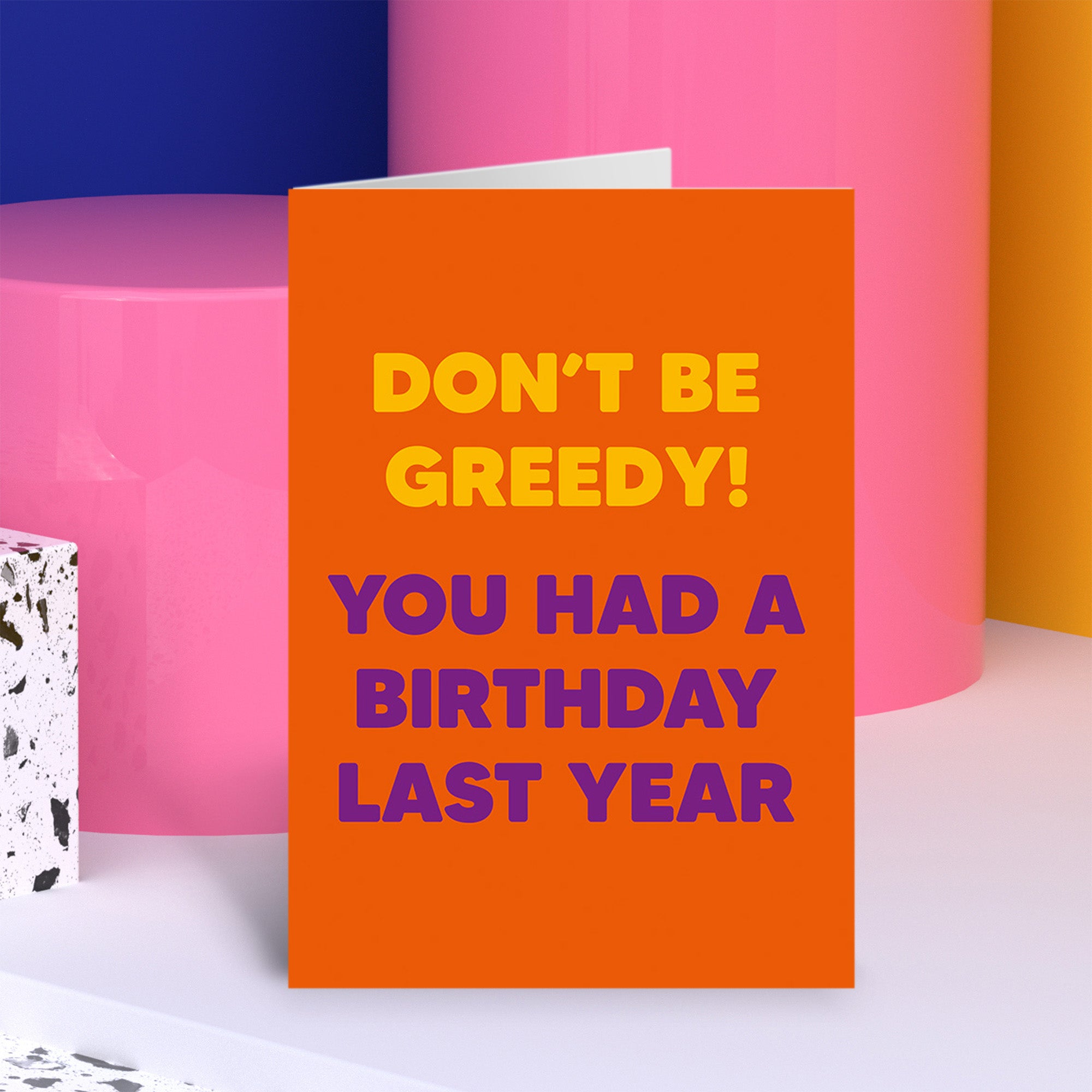 A greeting card featuring bold typographic text only. The background is a solid bright orange color. Large rounded yellow text at the top reads “Don’t be greedy!” and bold purple text below reads “You had a birthday last year.”