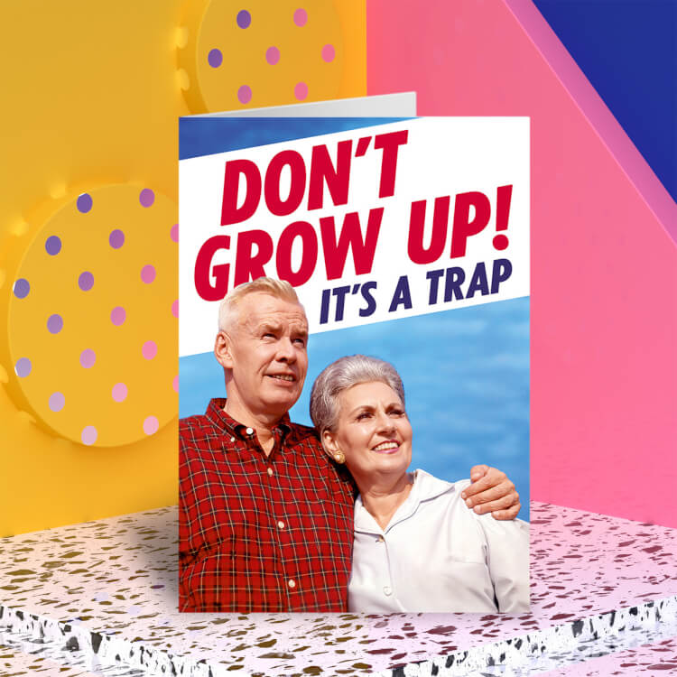A funny birthday with an elderly smiling couple looking away into the middle distance. In a slanted white box above them dark red and blue text teads Don't grow up, It's a trap.