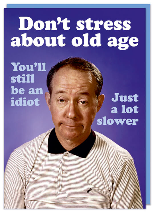 A birthday card with a 1960s dejected looking old man on the front against a purple background. White and light purple text around him reads Don't stress about old age. You'll still be an idiot. Just a lot slower.