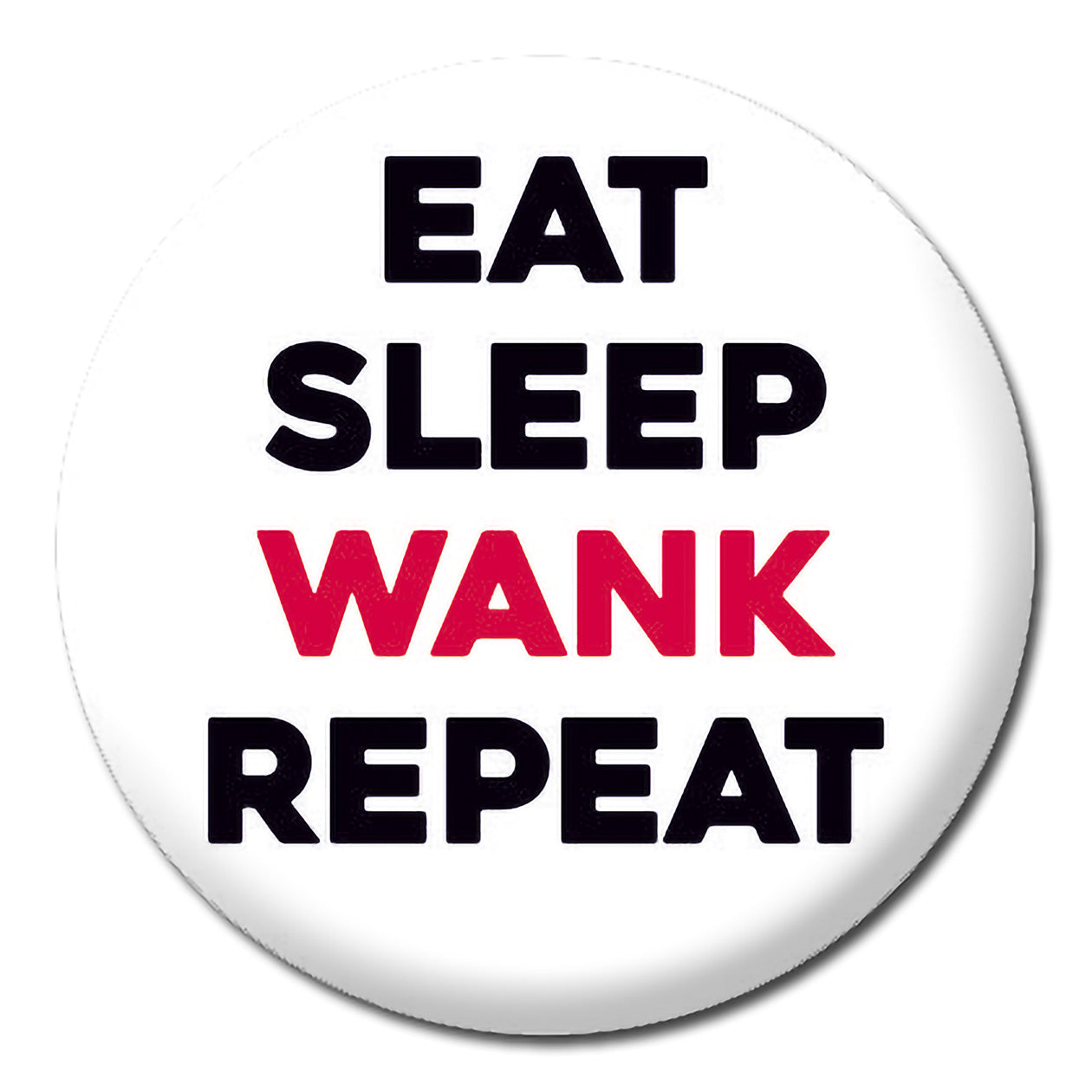 A round white badge featuring bold uppercase text stacked in four lines. The words “Eat,” “Sleep,” and “Repeat” are printed in black, while the word “Wank” is highlighted in red. There are no images or graphics, just the centered text.